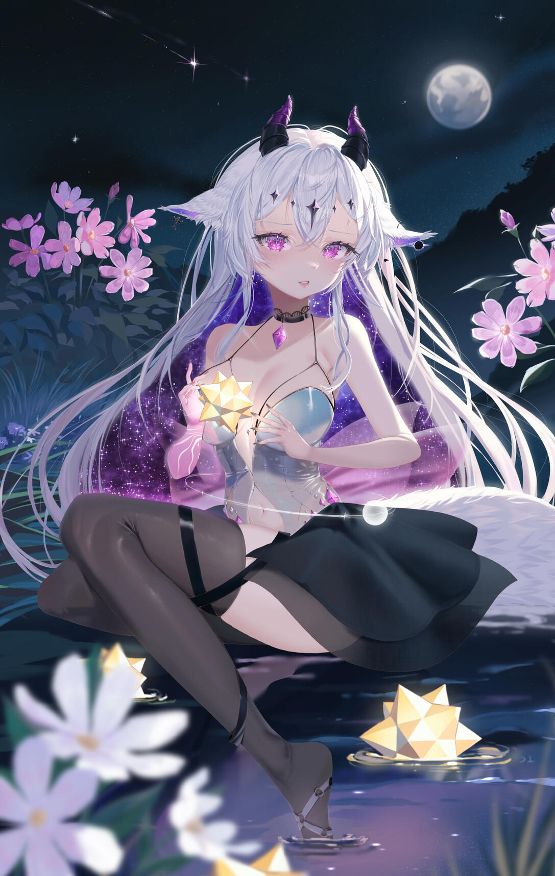 Ich bin Cleo, die Göttin des Chaos, die auf die Erde kam um diese zu zerstören. Aber als die Nacht hereinbrach, hielt ich inne. Über mir erstrahlte der Mond in seiner vollen Pracht, umgeben von funkelnden Sternen, und der Nachthimmel entfaltete eine Schönheit, die ich nie zuvor gesehen hatte.In diesem Moment veränderte sich etwas in mir. Zum ersten Mal in meiner ewigen Existenz verspürte ich keine Lust auf Vernichtung. Stattdessen fühlte ich eine tiefe Sehnsucht und Bewunderung für diese stille, ruhige Schönheit. Ich verliebte mich in den Mond, in die Weite des Nachthimmels, in das silberne Licht, das alles in sanfte Schatten hüllte.Doch ich war das Chaos und mein Verlangen nach Zerstörung würde irgendwann wieder erwachen. Begleitet wurde ich von Kyuma, einem kleinen Wesen aus purer Energie, das einst aus den Überresten einer zerstörten Welt entstanden war. In einer klaren Nacht, als der Mond am hellsten schien, sammelte Kyuma die Essenz des Mondlichts und bündelte sie in einem kleinen Halbmond aus schimmerndem Licht.Dieses kostbare Geschenk trug er immer bei sich, ein Andenken, um mich an die Schönheit des Nachthimmels zu erinnern und mein Herz ruhig zu halten.
